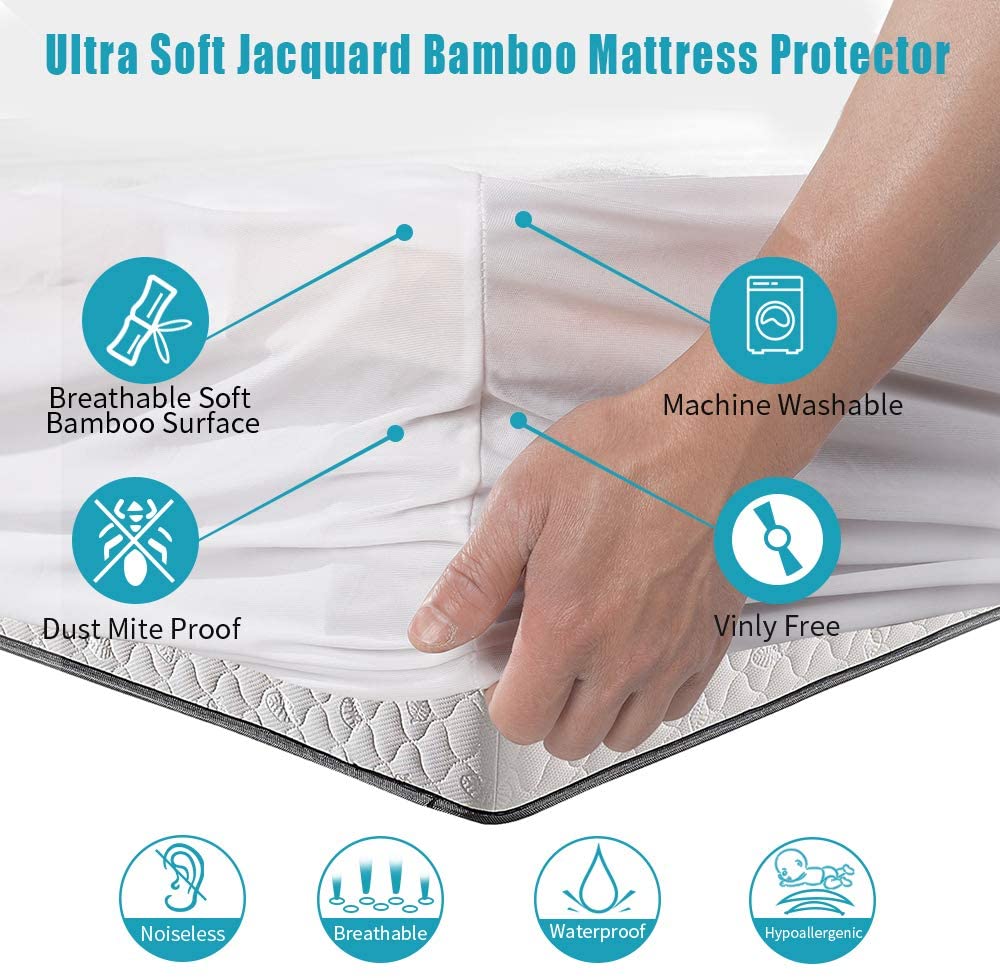 Mattress Protector Waterproof Soft & Cooling Bamboo Cover with Deep Pocket for Kids Adults | Organic & Breathable Encasement Quilted Fitted 8-18 inch| Urine Sweat Proof | Noiseless & Washable